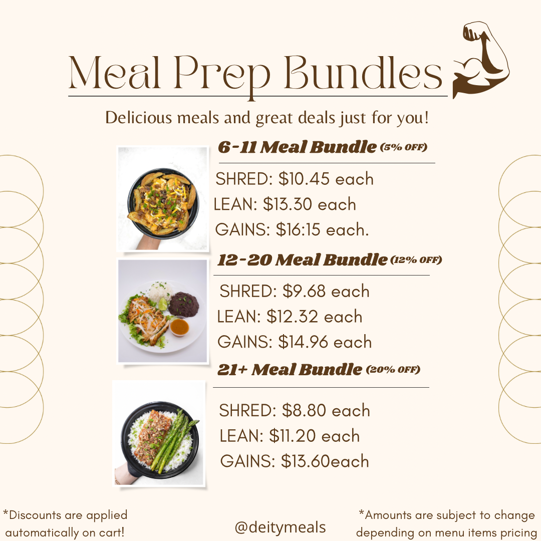NEW WEEK! NEW MENU! Dirty Fries 🍟🍔 Habanero Chicken🌶️🥵🔥Honey Peacan Chicken/Salmon🍯🍣 Berry Berry French Toast🍞🫐🍓Cookies & Cream, Piña ColadaOvernight Oats!🍍🥥 Lock in your orders before Friday 11:59PM. Once we are sold out, we will lock our website. We have bundle deals and individual pricing. If your address is out of our delivery zone, please reach out to us by text, Tony Gausin 623-810-0291. DISCOUNTS ARE AUTOMATICALLY ADDED.MIX & MATCH YOUR ITEMS(MUST BE SAME SIZE).