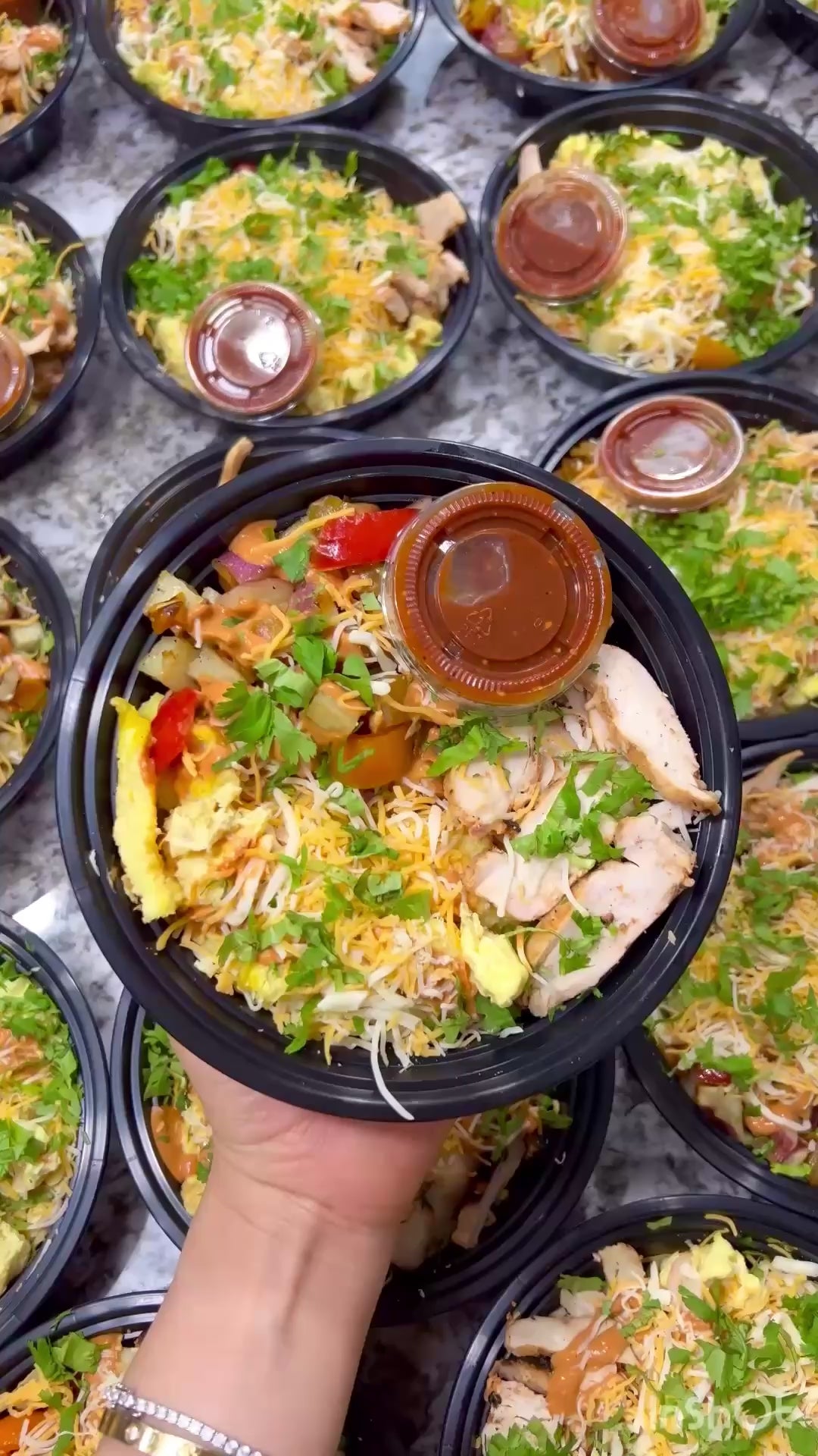 This breakfast bowl is a flavorful and satisfying start to your day. Grilled Chicken, golden-brown potatoes sautéed with peppers and onions, scrambled eggs, American cheese, salsa roja and a drizzle of a Non-fat Spicy Greek chipotle . This bowl is a delicious fusion of savory, spicy, cheesy, the best way to start your day!