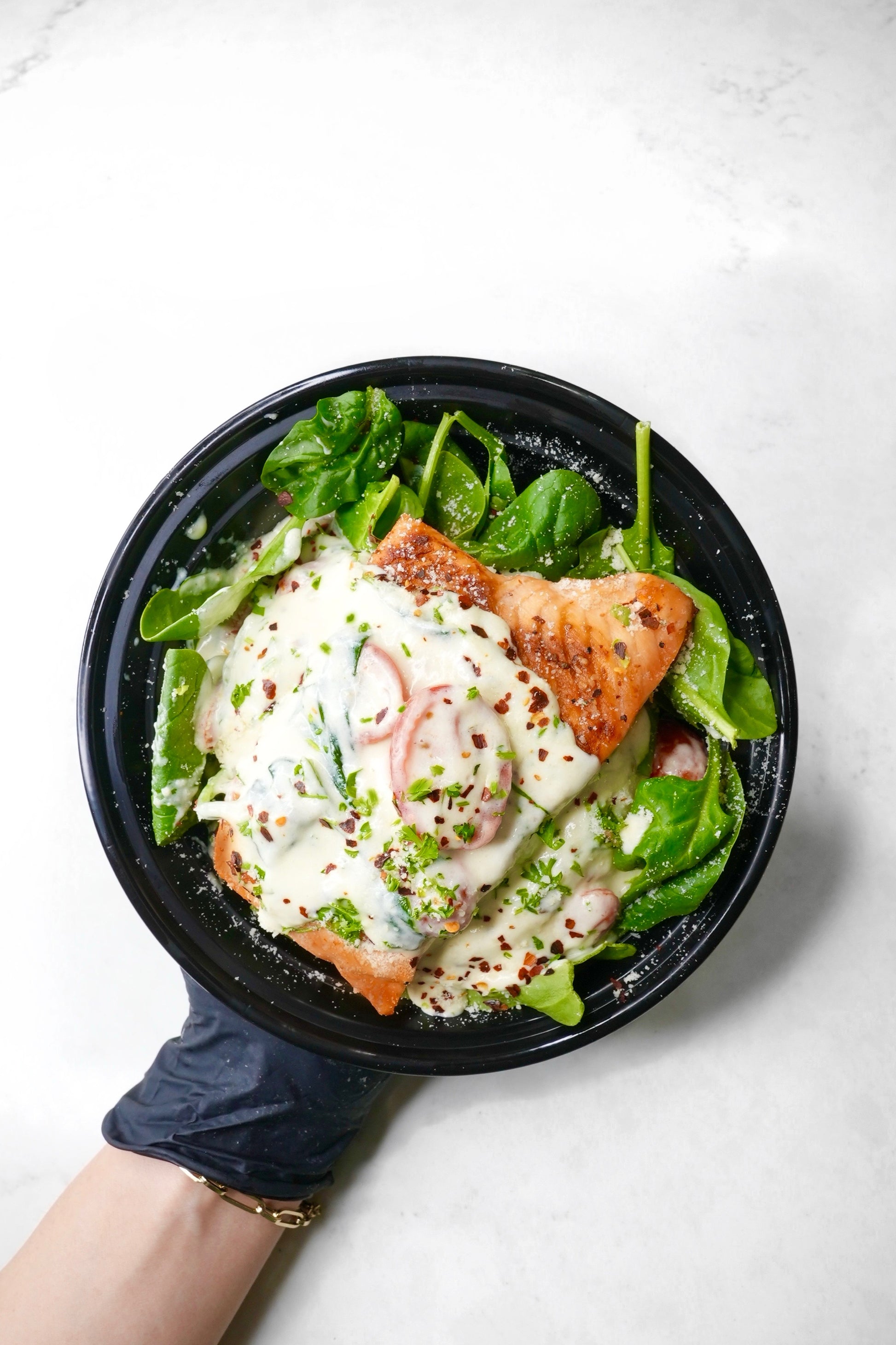 Salmon paired with a homemade tuscan sauce, organic grape tomato, organic spinach and white rice- All topped with red chili flakes/parsley. **ONLY SOLD IN LEAN