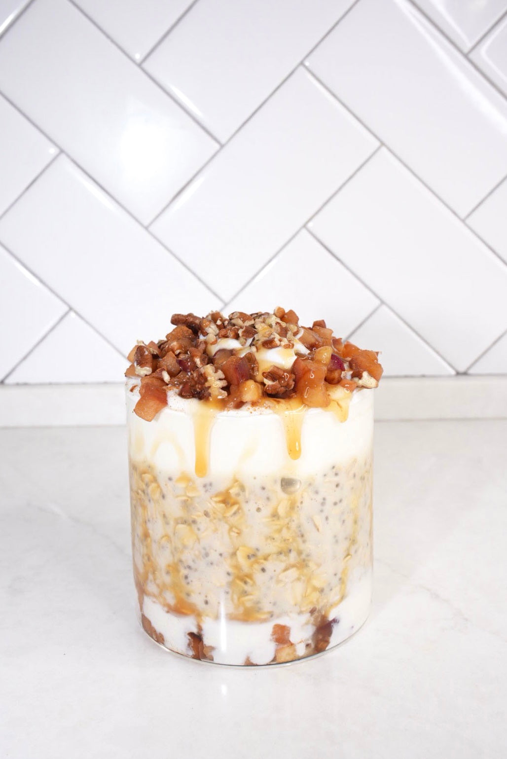 Oat milk, chia seeds, rolled oats, whey protein, layered over creamy greek yogurt, topped with cinnamon honey apples and crunchy pecans. This breakfast is basically dessert in disguise—minus the guilt! 🤌🏽